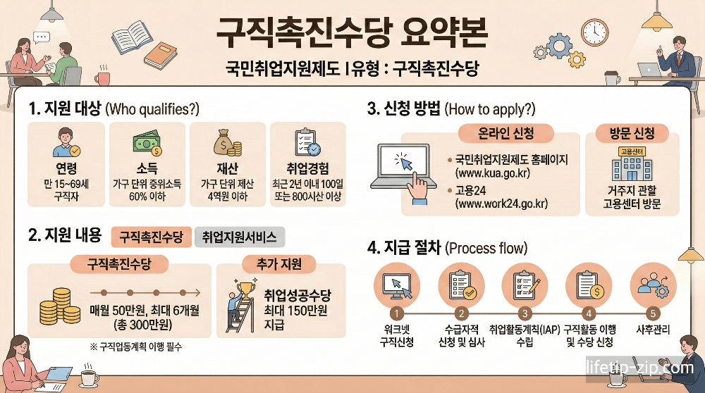 - 신청: 고용24(work24.go.kr) 구직등록 후 온라인 신청 또는 관할 고용센터 방문 / ☎ 1350