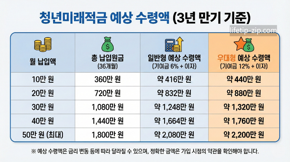 | 우대형 | 중위소득 100% 이하 또는 중소기업 취업 6개월 미만 | 12% | 정부 지원 2배, 실수령액 최대 |